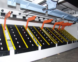 A lemez támasztását elülső támasztó karok segítik, a lemez továbbítást pedig a mellső támaszokon elhelyezett gördülő elemek. Vágáskor a lemezt leszorító hengerek rögzítik, a levágott részt pedig a hátsó billenők eresztik le. Hátulról a gépet fénysorompó védi.