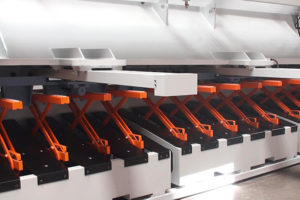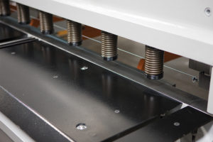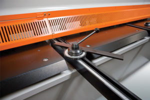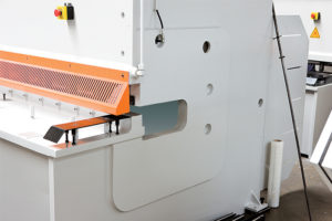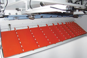 A lemez támasztását elülső támasztó karok segítik, a lemez továbbítást pedig a mellső támaszokon elhelyezett gördülő elemek. A vágás helyének beállítását árnyékvonal segítségével végezhetjük. A pontos beállítás érdekében a védőburkolat az első 1 m-en felhajtható. Vágáskor a lemezt leszorító hengerek rögzítik, a levágott részt pedig a hátsó billenők eresztik le. Hátulról a gépet fénysorompó védi.